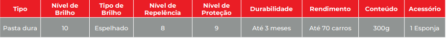 Cera totalmente sintética, desenvolvida especialmente para tons escuros como preto, chumbo, cinza, marrom, vermelho e azul. Proporciona brilho espelhado intenso, realçando a cor original da pintura, com proteção UVA/UVB e repelência à água e sujeira.